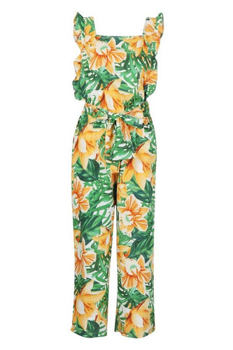 Ruffle Open Back Tropical Print Jumpsuit