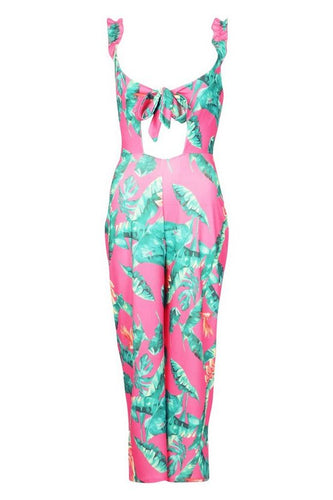 Knot Front Ruffle Strap Palm Print Jumpsuit