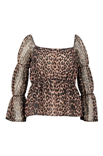 Plus Leopard Mesh Sleeve Sqaure Neck Peplum Top