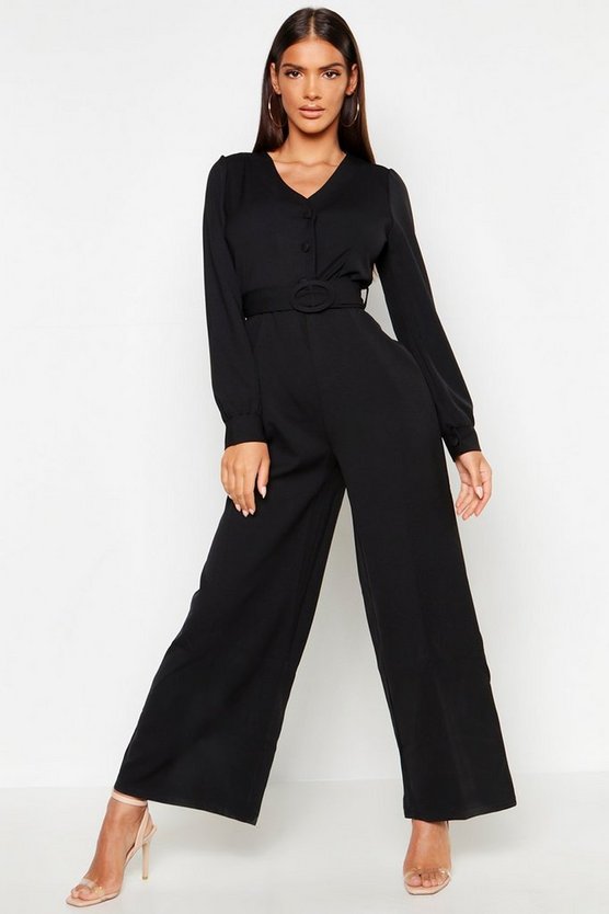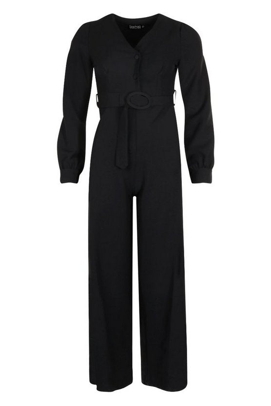 Button Detail Belted Wide Leg Jumpsuit