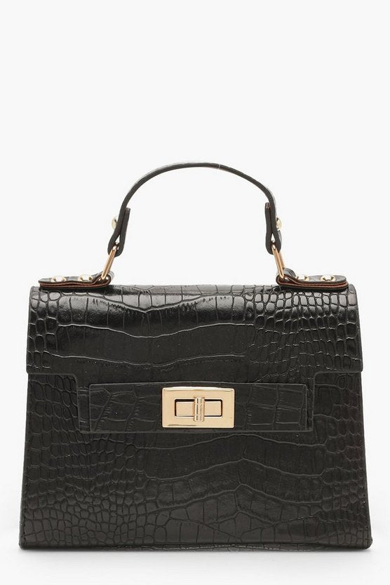 LENGTH: 15CM WIDTH: 19CM. Croc PU Material, Metal Twist Lock, Metal Stud Detailing.
